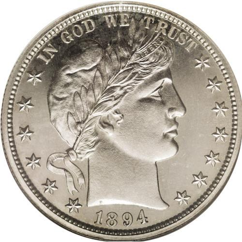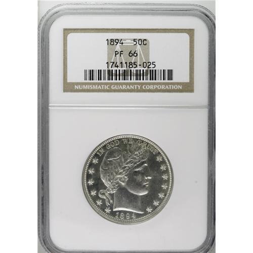 <B>1894 50C PR66 NGC.</B></I> Most collectors would regard the present specimen as a Cameo, since contrast is apparent between the lightly frosted motifs and the slightly cloudy fields. Two small areas on the portrait are unfrosted, the cheekbone and the skin near the ear, and these probably prevent a Cameo designation. Nonetheless, this assertively struck Premium Gem is free from visible detractions. Census: 26 in 66, 24 finer (10/06).<BR><I>From The James Paul Collection.</B></I><BR><BR><b>Shipping:</b> Coin/Currency (<a target="_blank" href="http://www.heritageauctions.com/common/shipping.php">view shipping information</a>)