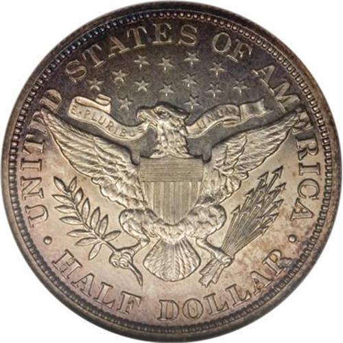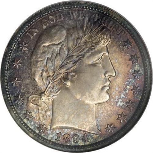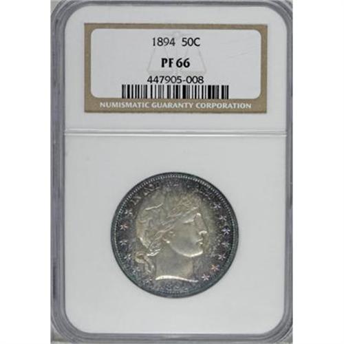 <B>1894 50C PR66 NGC.</B></I> A sharply detailed Premium Gem proof example, save for minor weakness in the upper right corner of the shield, this piece approaches the finest quality seen for the date. Walter Breen (1977) writes that these coins are "Usually only available badly cleaned." Both sides have notable contrast, and are visited with dapples of iridescent cobalt-blue, lavender, and golden-brown, that display somewhat deeper hues on the obverse. <BR><BR><B>Coin Engraver:</B> Charles E. Barber<BR><BR><b>Shipping:</b> Coins & Currency (<a target="_blank" href="http://www.heritageauctions.com/common/shipping.php">view shipping information</a>)