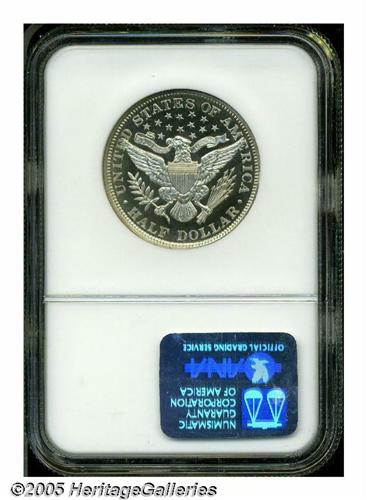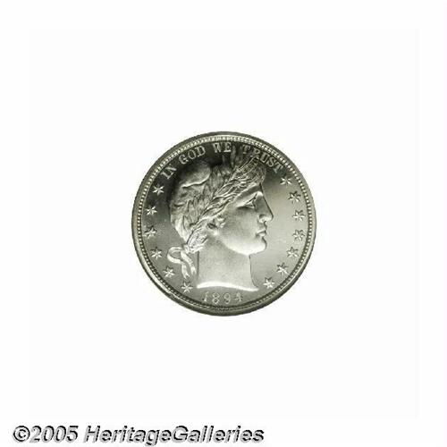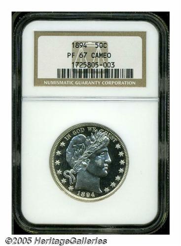 <B>1894<50C> PR67 Cameo NGC.</B></I> Bright snow-white overall, the fields are nicely mirrored and unhairlined. The devices show a moderate amount of frosting to complete the cameo contrast, and exhibit razor-sharp definition. This is a truly spectacular cameo. NGC and PCGS combined have certified just 8 examples in Superb Proof Cameo, with only two finer (6/05).