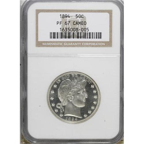 <B>1894 50C PR67 Cameo NGC.</B></I> This 1894 half dollar is an exceptional Superb Gem Cameo proof with brilliant silver surfaces on both sides. The contrast between the fields and devices is vibrant, a splendid white on black appearance. Every design element is bold, and the overall quality is nearly perfect. Census: 10 in 67 Cameo, 2 finer (1/08).<BR><BR><b>Shipping:</b> Coins & Currency (<a target="_blank" href="http://www.heritageauctions.com/common/shipping.php">view shipping information</a>)