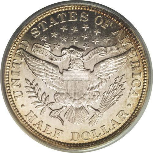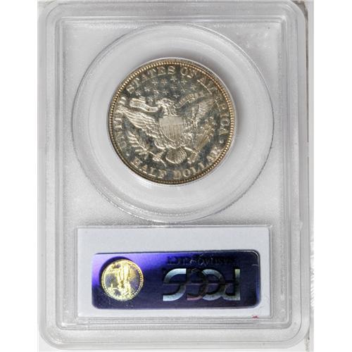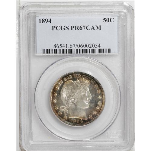 <B>1894<50C> PR67 Cameo PCGS.</B></I> Delectable amber-gold and sky-blue patina graces the rims on each side of this specimen, with brilliant centers and profoundly deep mirrors that contrast starkly with the frosty devices. Close perusal with a loupe fails to reveal anything other than a beautiful coin with no distractions, although the strike is a bit soft, as usual, on the upper right (facing) shield corner. Census: 8 in 67 Cameo, 2 finer (9/06).