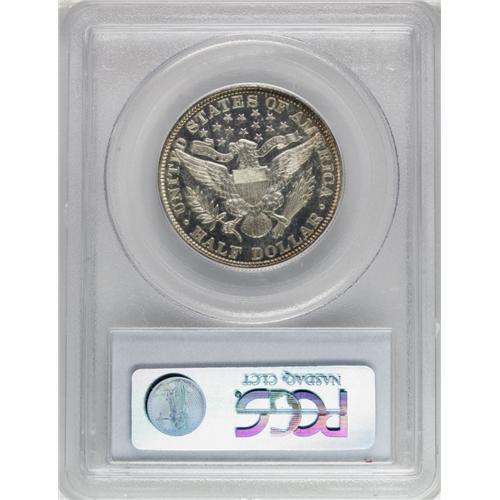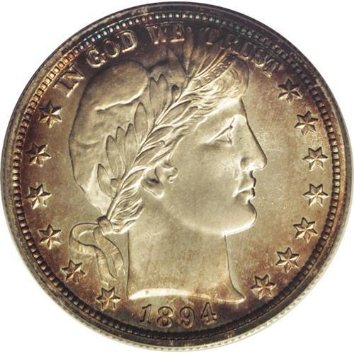 <B>1894 50C PR67 Cameo PCGS.</B></I> Delectable amber-gold and sky-blue patina graces the rims on each side of this specimen, with brilliant centers and profoundly deep mirrors that contrast starkly with the frosty devices. Close perusal with a loupe fails to reveal anything other than a beautiful coin with no distractions, although the strike is a bit soft, as usual, on the upper right (facing) shield corner. This Superb Gem is among the finest few of this early proof issue, as PCGS has certified only a single coin finer. Population: 2 in 67, 1 finer (12/06).<BR><BR><b>Shipping:</b> Coin/Currency (<a target="_blank" href="http://www.heritageauctions.com/common/shipping.php">view shipping information</a>)