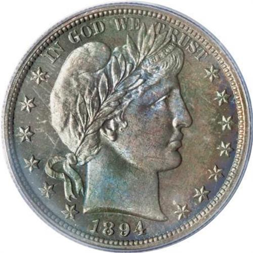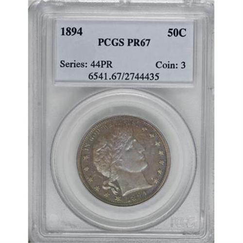 <B>1894 50C PR67 PCGS.</B></I> This is an exquisite and Superb Gem proof, with deep blue-gray and iridescent toning across the surfaces on both sides. Although the dark nature of the toning precludes a cameo designation, this impressive piece has lovely, if mild contrast on both sides. Population: 9 in 67, 0 finer (11/07). <BR><I>From The Kallenberg #1 PCGS Registry Set Of Proof Half Dollars.</B></I><BR><BR><B>Coin Engraver:</B> Charles E. Barber<BR><BR><b>Shipping:</b> Coins & Currency (<a target="_blank" href="http://www.heritageauctions.com/common/shipping.php">view shipping information</a>)