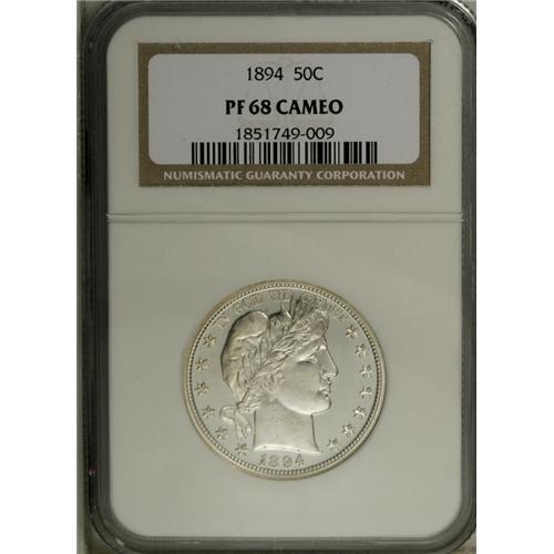 <B>1894 50C PR68 Cameo NGC.</B></I> It seems hard to believe by the standards of today's coinage, but after the introduction of the Barber half dollar, as well as the quarter and dime, in 1892, it took the Philadelphia Mint another five years to reach 2 million business strikes. Mint State examples from those early years are rare, putting added pressure on the proofs. 1894 saw a proof emission of 972 pieces, considerable for the time. It is difficult to believe that many pieces could exceed the present piece, either in terms of numerical grade or aesthetic appeal, and neither service has certified a finer piece. The surfaces are brilliant silver-white with no appreciable toning, good black-on-silver contrast, and a bold strike. Census: 2 in 68, 0 finer (11/06).<BR><BR><b>Shipping:</b> Coin/Currency (<a target="_blank" href="http://www.heritageauctions.com/common/shipping.php">view shipping information</a>)