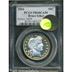 <B>1894 50C PR68 Cameo PCGS.</B></I> Rich honey-gold color illuminates the peripheries. The major devices are snow-white and exhibit exceptional white on black Cameo contrast. The strike is needle-sharp, even on the fletchings and right shield corner, which are often indifferently impressed. Only 972 proofs were produced, and only a handful of survivors can compete with the eye appeal of this immaculate specimen. As of (1/05), this is the single finest PCGS certified 1894 Half Dollar.<BR><I>From the Bruce Scher #1 All-Time PCGS Registry Set.</B></I> Lot:4110