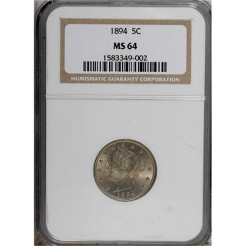 <B>1894 5C MS64 NGC.</B></I> NGC Census: (64/69). PCGS Population (95/61). Mintage: 5,413,132. Numismedia Wsl. Price for NGC/PCGS coin in MS64: $500. (#3855)<BR><BR><B>Coin Engraver:</B> Charles E. Barber<BR><BR><b>Shipping:</b> Coins & Currency (<a target="_blank" href="http://www.heritageauctions.com/common/shipping.php">view shipping information</a>)