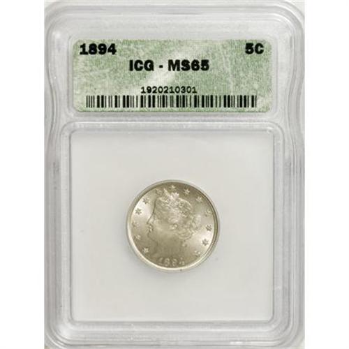 <B>1894 5C MS65 ICG.</B></I> Speckles of orange and pink patina appear across the satiny nickel-gray surfaces of this mid-date Liberty nickel Gem. Boldly impressed on the portrait, though the stars and wreath show a hint of softness.<BR><BR><B>Coin Engraver:</B> Charles E. Barber<BR><BR><b>Shipping:</b> Coins & Currency (<a target="_blank" href="http://www.heritageauctions.com/common/shipping.php">view shipping information</a>)