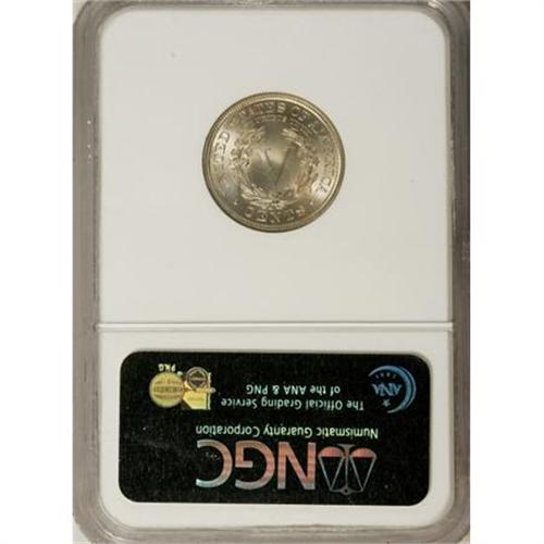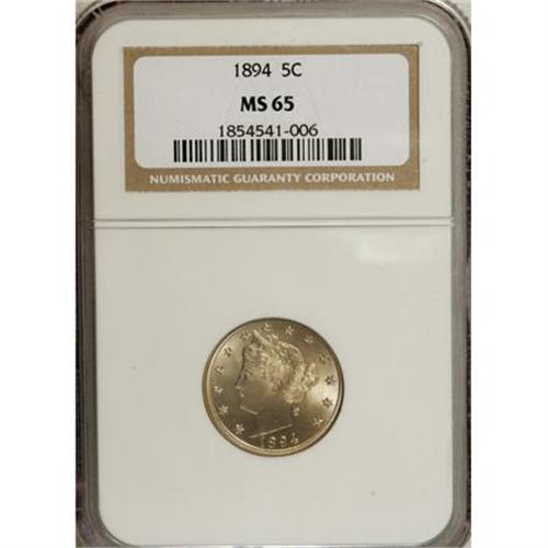 <B>1894 5C MS65 NGC.</B></I> A gorgeous Gem that offers highly lustrous, slightly satiny surfaces beneath a delicate veil of pink and orange patina. This carefully preserved piece would merit a higher grade if not for an indentation above Liberty's eye. Census: 51 in 65, 18 finer (6/07).<BR><BR><B>Coin Engraver:</B> Charles E. Barber<BR><BR><b>Shipping:</b> Coins & Currency (<a target="_blank" href="http://www.heritageauctions.com/common/shipping.php">view shipping information</a>\)