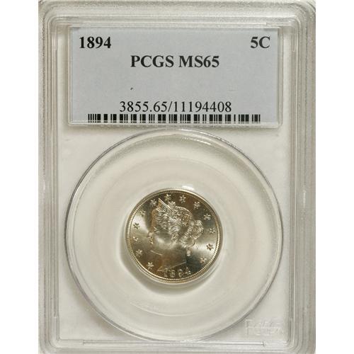 <B>1894 5C MS65 PCGS.</B></I> The shining obverse of this Gem displays little patina, though a splash of greenish-gold appears within the wreath. A long, thin abrasion appears to the left of Liberty's chin. Population: 55 in 65, 19 finer (3/07).<BR><BR><b>Shipping:</b> Coins & Currency (<a target="_blank" href="http://www.heritageauctions.com/common/shipping.php">view shipping information</a>)