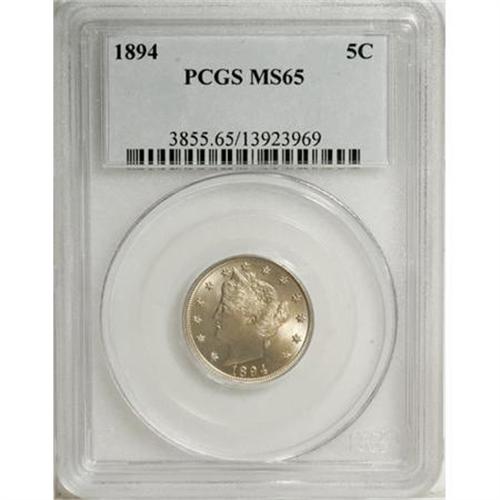 <B>1894 5C MS65 PCGS.</B></I> Boldly impressed in the centers with uncommonly vibrant luster for this mid-date issue. Delicate peach patina graces most of the obverse, while the reverse shows less patina. Population: 45 in 65, 19 finer (8/07).<BR><BR><B>Coin Engraver:</B> Charles E. Barber<BR><BR><b>Shipping:</b> Coins & Currency (<a target="_blank" href="http://www.heritageauctions.com/common/shipping.php">view shipping information</a>)