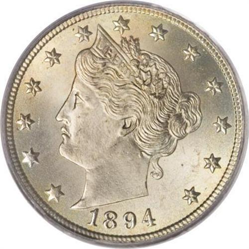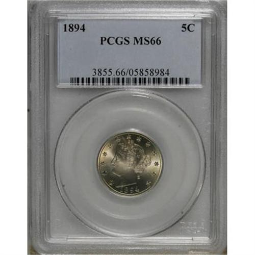 <B>1894 5C MS66 PCGS.</B></I> The luster of this attractive Premium Gem is uncommonly vibrant. The portrait and wreath are well-defined, though the stars on the obverse show slight softness. Delicate green-gold patina visits the obverse margins and silver-green toning prevails in the center, while on the reverse, the colors are reversed. Population: 22 in 66, 0 finer (3/08).<BR><BR><B>Coin Engraver:</B> Charles E. Barber<BR><BR><b>Shipping:</b> Coins & Currency (<a target="_blank" href="http://www.heritageauctions.com/common/shipping.php">view shipping information</a>)
