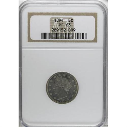 <B>1894 5C PR63 NGC.</B></I> NGC Census: (51/281). PCGS Population (118/311). Mintage: 2,632. Numismedia Wsl. Price for NGC/PCGS coin in PR63: $204. (#3892)<BR><BR><B>Coin Engraver:</B> Charles E. Barber<BR><BR><b>Shipping:</b> Coins & Currency (<a target="_blank" href="http://www.heritageauctions.com/common/shipping.php">view shipping information</a>)
