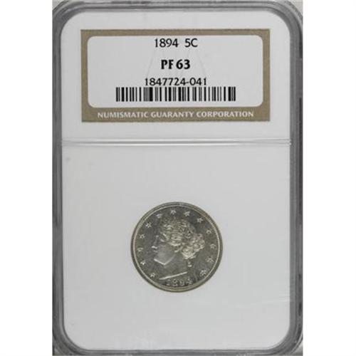 <B>1894 5C PR63 NGC.</B></I> NGC Census: (51/283). PCGS Population (118/310). Mintage: 2,632. Numismedia Wsl. Price for NGC/PCGS coin in PR63: $210. (#3892)<BR><BR><B>Coin Engraver:</B> Charles E. Barber<BR><BR><b>Shipping:</b> Coins & Currency (<a target="_blank" href="http://www.heritageauctions.com/common/shipping.php">view shipping information</a>)