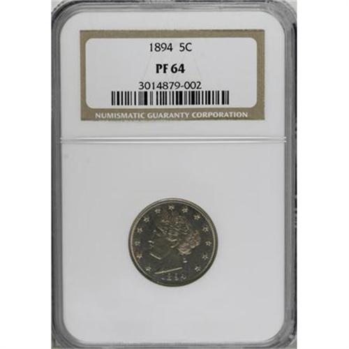 <B>1894 5C PR64 NGC.</B></I> NGC Census: (130/151). PCGS Population (188/123). Mintage: 2,632. Numismedia Wsl. Price for NGC/PCGS coin in PR64: $260. (#3892)<BR><BR><B>Coin Engraver:</B> Charles E. Barber<BR><BR><b>Shipping:</b> Coins & Currency (<a target="_blank" href="http://www.heritageauctions.com/common/shipping.php">view shipping information</a>)
