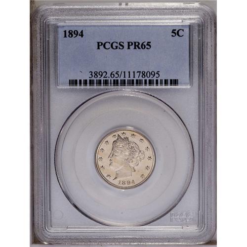 <B>1894<5C> PR65 PCGS.</B></I> A sharp impression with light cameo contrast. The fields on each side of this scarce issue are fully mirrored with lightly frosted devices. The obverse is mostly brilliant and the reverse has light gold toning. <BR><BR><B>Important notice:</B> Heritage usually auctions material at the rate of 200-250 lots per hour. On some occasions eBay Live bid software or the Internet may not be able to keep up with the pace of the auction. We recommend placing a realistic absentee bid now as insurance to avoid disappointment. Occasionally the auctioneer may eliminate or reject an eBay Live bid, and the auctioneer may also reopen a lot after the close of the eBay live bidding (usually because we missed an audience bid), and may reject your bid even if it shows you as the winning bidder. By bidding via eBay Live, you agree that Heritage may award the lot to another bidder at its sole discretion under the circumstances described above or any other reasonable circumstances. Since eBay bids are not shown to us until we open the lot on the floor, we treat those bids just like floor bids. In most cases the floor responds before the eBay bid is presented to us, due to Internet lag time, so for consistency we have made it a policy that floor bids are always considered first over tie eBay live bids. Also please note that all Heritage lots purchased through eBay Live carry a 20% Buyer's Premium. Please make sure you read the Terms and Conditions before you bid. This lot is being auctioned in conjunction with a live floor auction by Heritage Galleries & Auctioneers. All final auction and invoice information will be supplied by Heritage Galleries & Auctioneers, and all other information should be considered preliminary. Lot:1002 <BR><BR><B>Winning Notification and Billing:</B> After the FINAL session in this auction is complete, Heritage will send e-mail and snail mail invoices. This process normally takes several days. All final auction and invoice information will be supplied by Heritage Galleries & Auctioneers, and all other information should be considered preliminary. <BR><BR>This auction will be conducted on a live auction floor and over the Internet through eBay Live. If you choose to place an absentee bid, please take a moment to <font color='#0000ff'><u><a href='http://pages.ebay.com/liveauctions/help/before/laabsentee.html'>learn how eBay Live absentee bidding works</a></u></font><font color='#000000'>