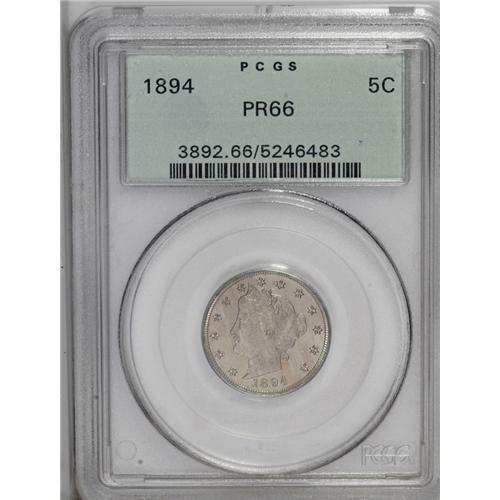 <B>1894<5C> PR66 PCGS.</B></I> Apricot and lilac colors illuminate this lovingly preserved and attractive high grade proof. Even the often troublesome left ear of corn is boldly struck by the dies. In a green label holder. Population: 17 in 66, 2 finer (7/06).<BR><I>From The Troy Wiseman Collection.</B></I>