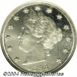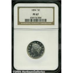 <B>1894<5C> PR67 NGC.</B></I> A scintillating, untoned Superb Gem with dazzling depth to the mirror surfaces and no visible carbon on either side. Relatively few 1894 proofs survive either this nice or this flashy. Population: 7 in 67, 2 finer (7/04). <BR><BR><B>Important notice:</B> Heritage usually auctions material at the rate of 200-250 lots per hour. On some occasions eBay Live bid software or the Internet may not be able to keep up with the pace of the auction. We recommend placing a realistic absentee bid now as insurance to avoid disappointment. Occasionally the auctioneer may eliminate or reject an eBay Live bid, and the auctioneer may also reopen a lot after the close of the eBay live bidding (usually because we missed an audience bid), and may reject your bid even if it shows you as the winning bidder. By bidding via eBay Live, you agree that Heritage may award the lot to another bidder at its sole discretion under the circumstances described above or any other reasonable circumstances. Since eBay bids are not shown to us until we open the lot on the floor, we treat those bids just like floor bids. In most cases the floor responds before the eBay bid is presented to us, due to Internet lag time, so for consistency we have made it a policy that floor bids are always considered first over tie eBay live bids. Also please note that all Heritage lots purchased through eBay Live carry a 20% Buyer's Premium. Please make sure you read the Terms and Conditions before you bid. </span></font></tr></table></td></tr></table>