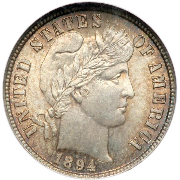 1894. NGC graded MS-66. Lovely satiny surfaces delicately toned. A gem of the purest serene beauty. This needle-sharp Gem among the finest survivors from a low 1,330,000 mintage. Pop 8; 3 in 67.
