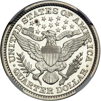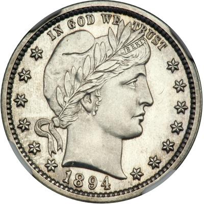 1894 Barber Quarter Dollar. NGC graded Proof 63 Cameo. Mostly untoned. Lovely cameo frost -- dates in the 1890s, in particular, often display strong cameo contrast between the frosted devices and mirrored field. Only 972 Proofs struck.