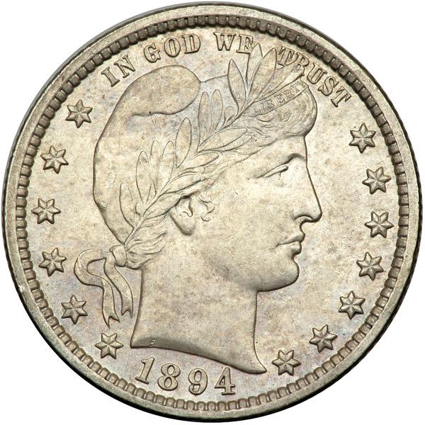 1894 Barber Quarter Dollar. PCGS graded MS-63. Well struck and mostly untoned (PCGS # 5607) .