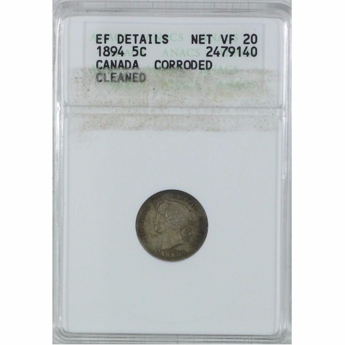 1894 Canada 5-cent ANACS Certified VF-20 (corroded) - Sticker residue. Buyers Premium will be added on all items as per our terms of sale. We accept Paypal, Credit Card, E-Transfer Payments, Cheque or Money Orders (there is an additional 3% fee for using Paypal or Credit Card). All invoices will be emailed immediately following the auction, please contact us if you would like to pay by credit card or receive a new revised lower total for mailing in payment or sending an e-transfer (3% discount). All Items Are Sold "AS IS", no returns