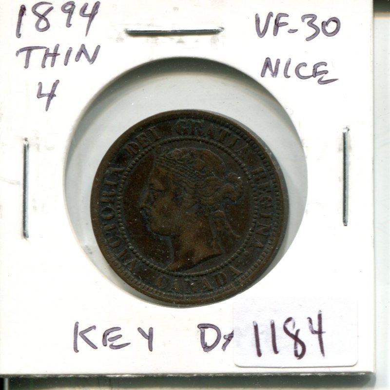 1894 Canadian Victorian Large Cent Thin 4 variety. VF-30. Key Date. Nice.