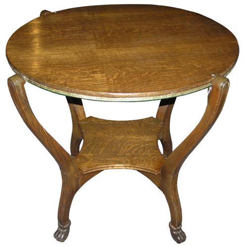 This is a tilt-top game (or center) table designed and patented by George Hunzinger (1835-1898) in 1894. It features his patented hinge that allows the top to tilt and lock into place. Underside has a relatively new green leatherette top, and the decorative brass along the edge is not original. Animal claw feet. Medial shelf with Hunzinger metal label on underside. Top measures 30" across and table height is 28 5/8".