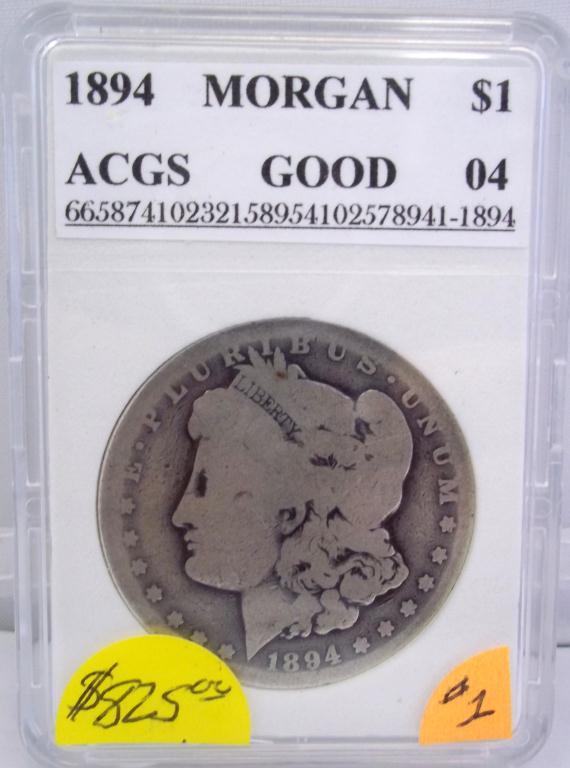 Silver Dollar certified by ACGS and graded Good-04. Low Mintage coin: Only 110,000 made