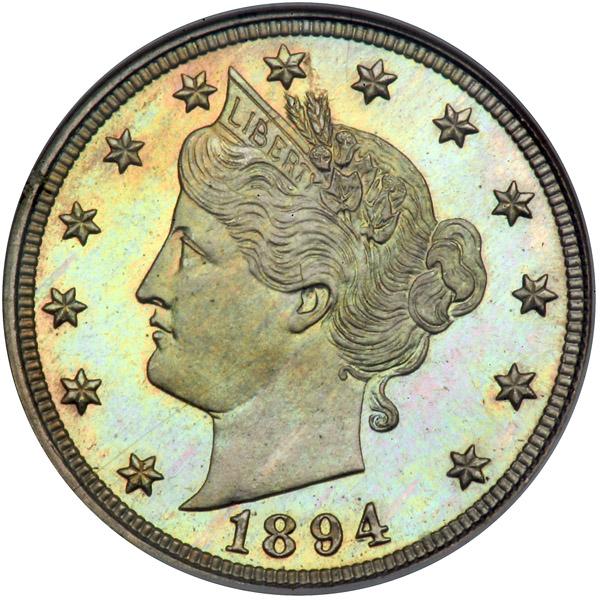 1894 Liberty Nickel. NGC graded Proof 67 Cameo. An absolutely gorgeous Cameo Gem Proof. The lovely soft pastel colors certainly adds to its beauty. Only 2,632 Proofs struck. Pop 5; none finer. Here is a gem that should realize a premium bid.