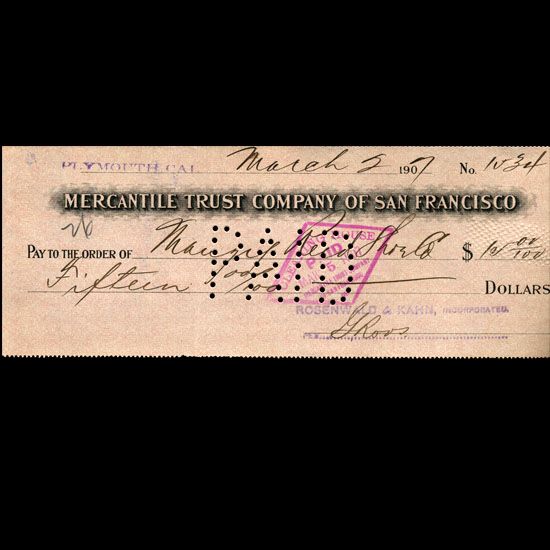 Rare 1907 original bank cashiers check with excellent cut-thru paid cancellation