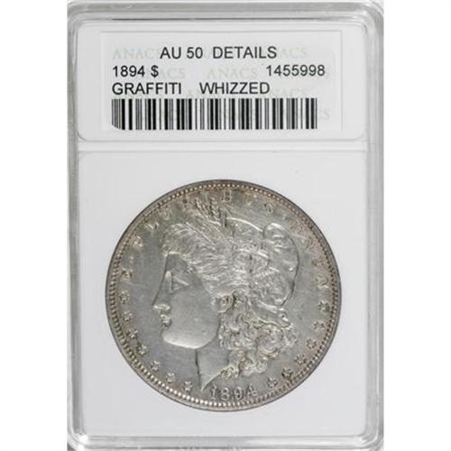 <B>1894 $1 --Graffiti, Whizzed--ANACS. AU50 Details.</B></I> This key date dollar is granular and hairlined from whizzing, and the eagle's breast has a few criss-cross fine lines from an idle hour long ago. Still a sharp example of this low mintage issue. The borders are toned light to medium gold.<BR><BR><b>Shipping:</b> Coins & Currency (<a target="_blank" href="http://www.heritageauctions.com/common/shipping.php">view shipping information</a>)