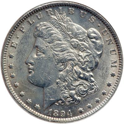 1894 Morgan Dollar. NGC graded AU-55. Scarce date. A lustrous, well struck coin that defines the AU55 grade (PCGS # 7228) .