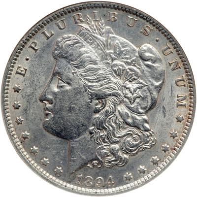 1894 Morgan Dollar. NGC graded AU-55. Scarce date. Clearly a step above an average AU specimen, this displays ample luster on both sides, excellent workmanship from a full strike by the dies, and careful handling by the previous owners (PCGS # 7228) .