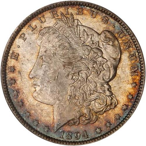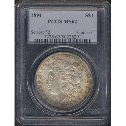 <b>1894 Morgan Dollar. PCGS graded MS62.</b> Choice mint luster characterizes the surfaces on this lovely toned piece, one of the scarce P-mint issues from 1894. Mostly well struck on the legends and main device, with just a touch of weakness above the ear and on some of the eagle's chest feathers. A tiny nick on the chin below the lips, along with a few scuffs in the otherwise smooth frost of Liberty's cheek, makes this a choice MS62 example with suggestions for yet a higher grade <b>(PCGS # 7228)</b>