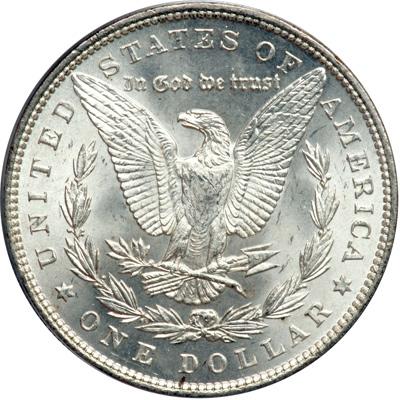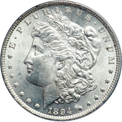 1894 Morgan Dollar. PCGS graded MS-62. Semi key date. Only 110,000 pieces coined. A nice, lustrous example with white clear surfaces surrounding Liberty. Several abrasions are noticeable on the cheek and the obverse field while the reverse exhibits a single distraction on the eagle's breast. Contemporary records do not record why mintage fell off in 1893-95 at the Philadelphia Mint before rebounding from 1896-on. It may have had something to do with economic conditions in those years. Or it could be a surfeit of circulating coins had built up in the Treasury vaults (PCGS # 7228) .