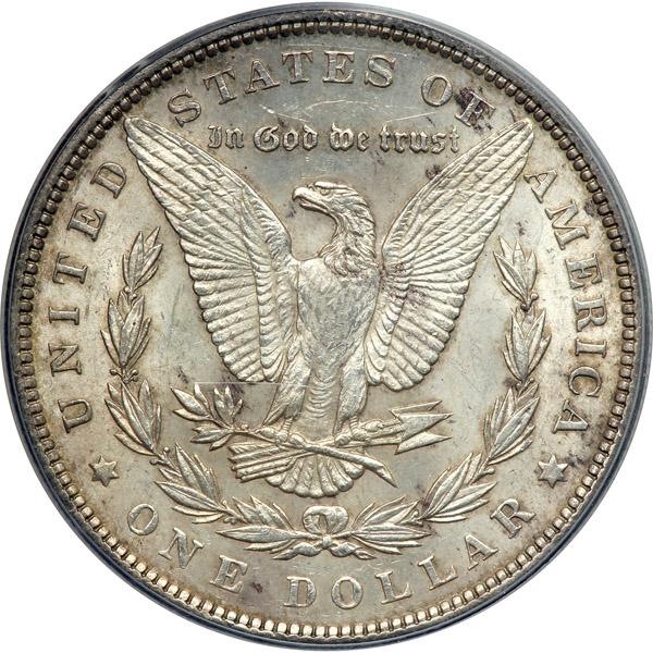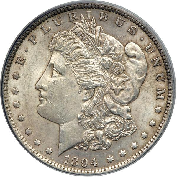 1894 Morgan Dollar. PCGS graded AU-58. Popular low mintage date, only 110,000 made, which is 10,000 more than the key 1893-S. Some might think this is unfair. However, survival of the 1894 seems to be higher than the '93-S. Attractively toned, extensive luster. A few marks at the lips and below the eye (PCGS # 7228) .
