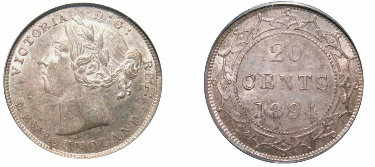 1894 Nfld Obv.2 20¢ PCGS and ICCS MS64, superb example. Superbly toned with great luster! Rare!