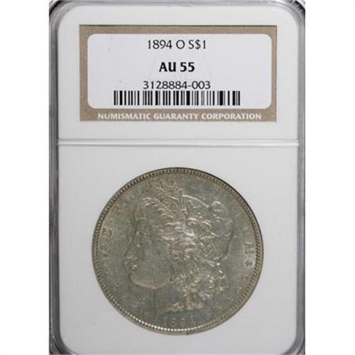 <B>1894-O $1 AU55 NGC.</B></I> NGC Census: (330/1365). PCGS Population (390/1439). Mintage: 1,723,000. Numismedia Wsl. Price for NGC/PCGS coin in AU55: $275. (#7230)<BR><BR><B>Coin Engraver:</B> George T. Morgan<BR><BR><b>Shipping:</b> Coins & Currency (<a target="_blank" href="http://www.heritageauctions.com/common/shipping.php">view shipping information</a>)