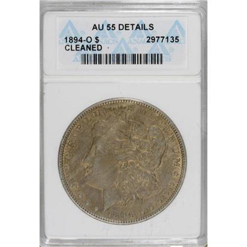 <B>1894-O $1 --Cleaned--ANACS. AU55 Details.</B></I> NGC Census: (305/1263). PCGS Population (360/1299). Mintage: 1,723,000. Numismedia Wsl. Price for NGC/PCGS coin in AU55: $275. (#7230)<BR><BR><b>Shipping:</b> Coins & Currency (<a target="_blank" href="http://www.heritageauctions.com/common/shipping.php">view shipping information</a>)