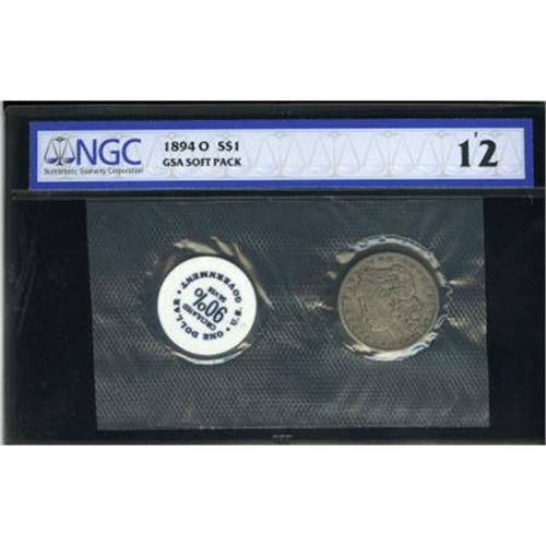<B>1894-O $1 F12 NGC.</B></I> GSA Soft Pack with a blue envelope and two Certificates of GSA Issue. NGC Census: (8/2625). PCGS Population (18/2614). Mintage: 1,723,000. Numismedia Wsl. Price for NGC/PCGS coin in F12: $46. (#7230)<BR><BR><B>Coin Engraver:</B> George T. Morgan<BR><BR><b>Shipping:</b> Coins & Currency (<a target="_blank" href="http://www.heritageauctions.com/common/shipping.php">view shipping information</a>)