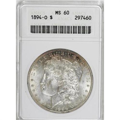 <B>1894-O $1 MS60 ANACS.</B></I> NGC Census: (100/675). PCGS Population (69/907). Mintage: 1,723,000. Numismedia Wsl. Price for NGC/PCGS coin in MS60: $540. (#7230)<BR><BR><B>Coin Engraver:</B> George T. Morgan<BR><BR><b>Shipping:</b> Coins & Currency (<a target="_blank" href="http://www.heritageauctions.com/common/shipping.php">view shipping information</a>)
