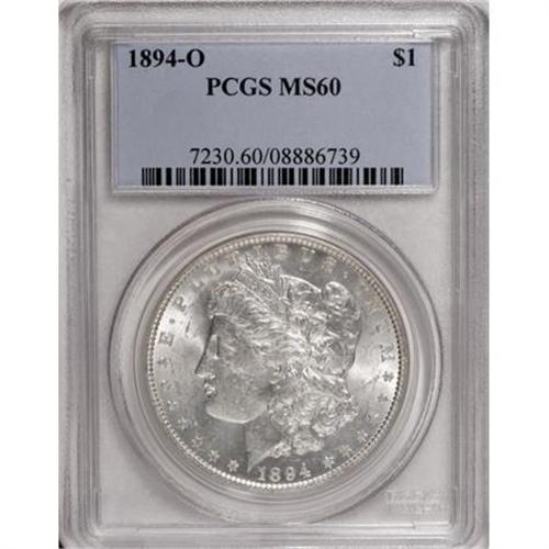 <B>1894-O $1 MS60 PCGS.</B></I> Strongly lustrous and untoned save for a small grease streak below the eagle's left (facing) wing. Though both sides show numerous light to moderate abrasions, the overall appearance is better than the MS60 designation might suggest.<BR><I>From The Oxford Collection.</B></I><BR><BR><B>Coin Engraver:</B> George T. Morgan<BR><BR><b>Shipping:</b> Coins & Currency (<a target="_blank" href="http://www.heritageauctions.com/common/shipping.php">view shipping information</a>)