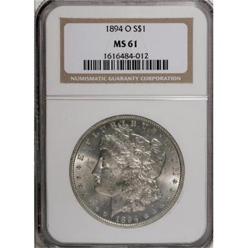 <B>1894-O $1 MS61 NGC.</B></I> A single mark on Liberty's cheek seems to be all that keeps this from a higher grade. Both sides are lustrous with frosty silver surfaces and pale grayish toning.<BR><BR><B>Coin Engraver:</B> George T. Morgan<BR><BR><b>Shipping:</b> Coins & Currency (<a target="_blank" href="http://www.heritageauctions.com/common/shipping.php">view shipping information</a>)