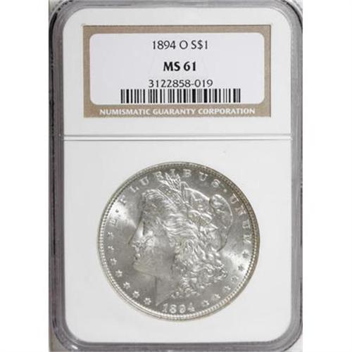 <B>1894-O $1 MS61 NGC.</B></I> Powerful luster and minimal patina are the prime draws of this well struck O-mint Morgan dollar. Both sides show a number of light to moderate marks, and a significant abrasion appears on Liberty's cheek and nose.<BR><BR><B>Coin Engraver:</B> George T. Morgan<BR><BR><b>Shipping:</b> Coins & Currency (<a target="_blank" href="http://www.heritageauctions.com/common/shipping.php">view shipping information</a>)