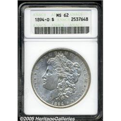 <B>1894-O<img border='0' src='http://www.heritagecoins.com/images/star.gif' width=10 height=10>$1 MS62 ANACS.</B></I> The 1894-O is a scarce issue from the mid-1890s that is usually encountered in lower grades and with sub-standard luster. This is a satiny example that is well defined and shows just the slightest hint of peripheral coloration.