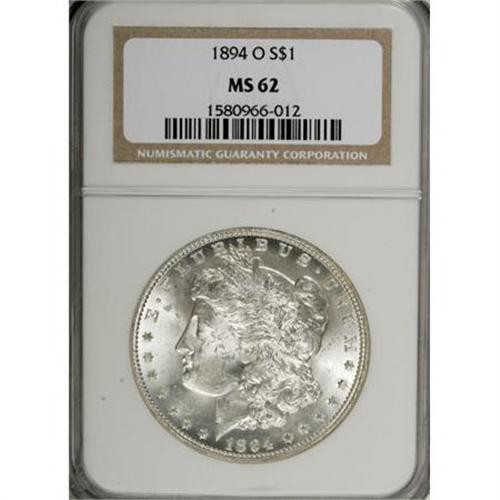 <B>1894-O $1 MS62 NGC.</B></I> The 1894-O is fairly scarce in mint State, and also comes weakly struck (David Bowers, 2006). This lustrous piece is untoned, and shows some definition in the hair at Liberty's ear and on the eagle's breast. Minute obverse marks limit the grade.<BR><BR><B>Coin Engraver:</B> George T. Morgan<BR><BR><b>Shipping:</b> Coins & Currency (<a target="_blank" href="http://www.heritageauctions.com/common/shipping.php">view shipping information</a>)