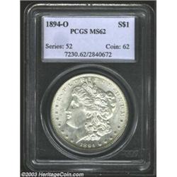 1894-O $1 MS62 PCGS. Essentially brilliant with semi-prooflike fields and satiny luster, there ar...