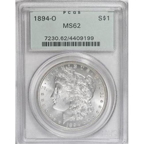 <B>1894-O $1 MS62 PCGS.</B></I> Lustrous and close to brilliant with a typical O-mint strike at the centers. There are fewer marks than expected of the grade. The fields are particularly clean. In a green label holder.<BR><BR><b>Shipping:</b> Coins & Currency (<a target="_blank" href="http://www.heritageauctions.com/common/shipping.php">view shipping information</a>)