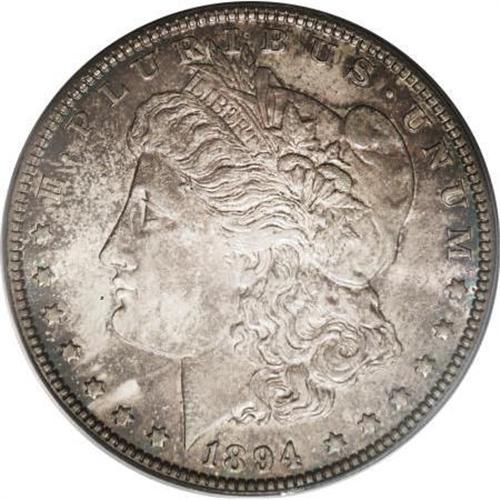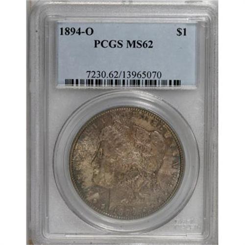 <B>1894-O $1 MS62 PCGS.</B></I> The obverse has mottled ivory, lilac, and blue toning, and the reverse is nearly brilliant white with only hints of gold color. The surfaces are satiny and fully lustrous, marred only by a few trivial handling marks, including a small dent on Liberty's chin.<BR><BR><B>Coin Engraver:</B> George T. Morgan<BR><BR><b>Shipping:</b> Coins & Currency (<a target="_blank" href="http://www.heritageauctions.com/common/shipping.php">view shipping information</a>)