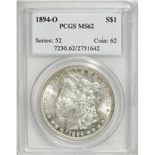 <B>1894-O $1 MS62 PCGS.</B></I> A typically soft strike leaves the central design highpoints poorly defined on both sides. The lustrous surfaces show a faint degree of peripheral toning on the obverse, and more noticeable amber-gold and cobalt-blue coloration near the reverse borders. A fairly scarce O-mint issue in Mint State, according to Bowers (2006). <BR><I>From The Mario Eller Collection, Part Two.</B></I><BR><BR><B>Coin Engraver:</B> George T. Morgan<BR><BR><b>Shipping:</b> Coins & Currency (<a target="_blank" href="http://www.heritageauctions.com/common/shipping.php">view shipping information</a>)